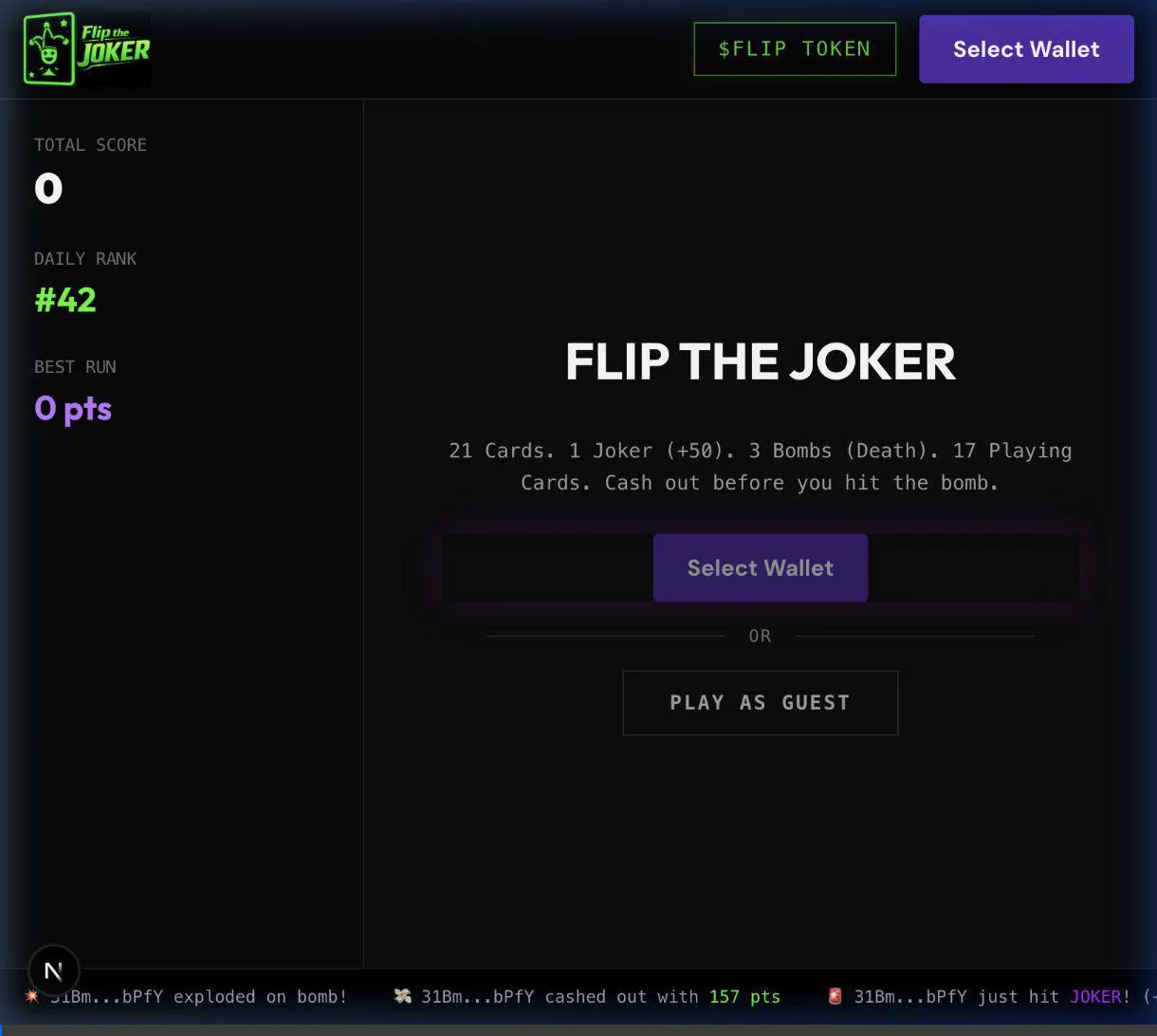 Players connect their wallet, flip cards, and try to survive the deck while hunting for the Joker. Every safe card increases your score — but one wrong flip can end the round.